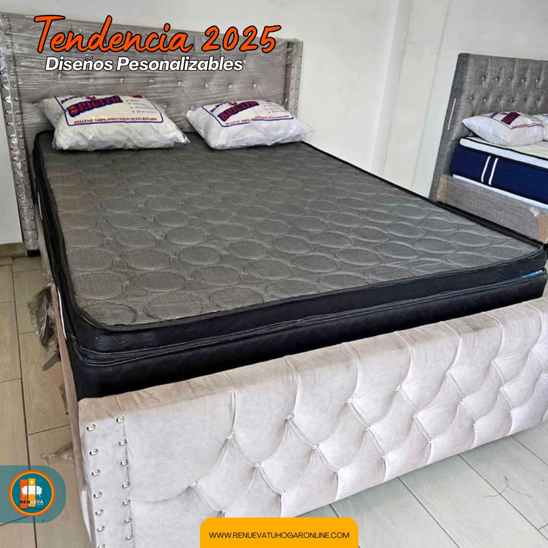 Incluye colchón semi ortopédico resortado de 25 cm de grosor, base cama y espaldar (cabecero). Puedes elegir entre más de 600 diseños y personalizar el color según tu gusto.